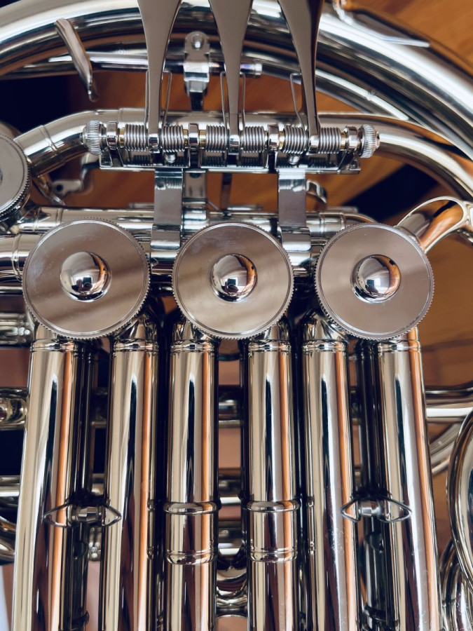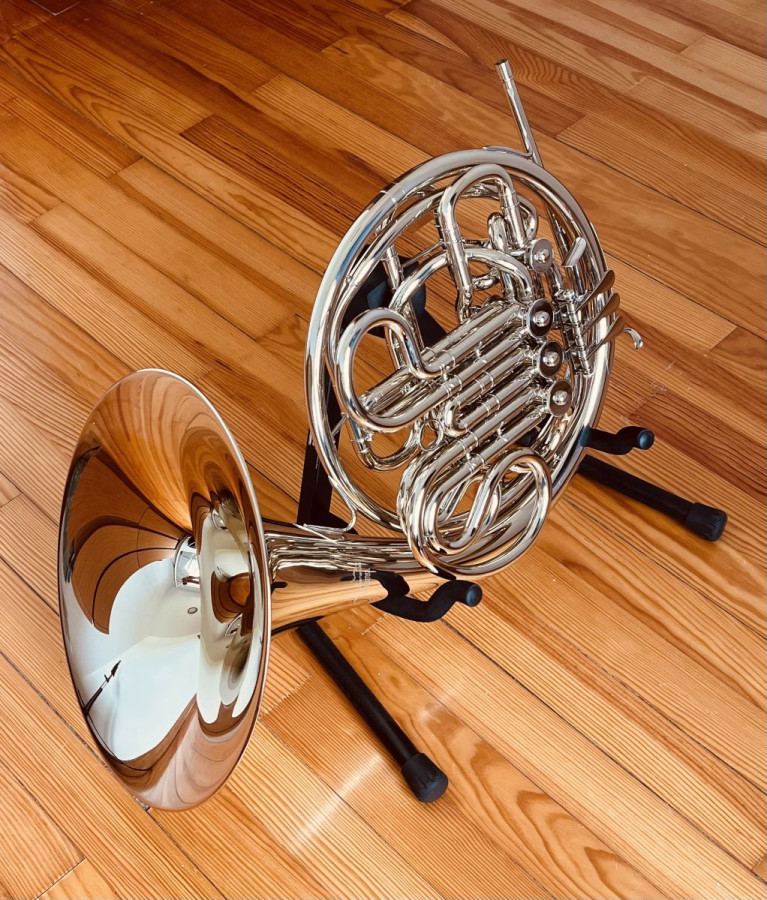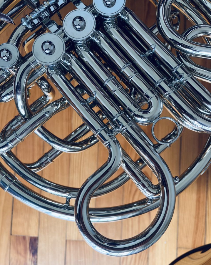 Double French Horn. - Includes hard case. - Instrument in excellent condition. - Ideal for professional musicians or advanced students. The price also includes two additional mouthpieces, an instrument stand, cleaning kit, and accessories.