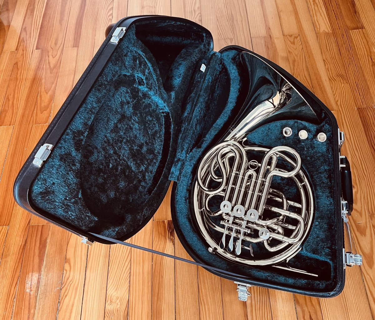 Doble trompa. - Incluye estuche rígido. - Instrumento en excelentes condiciones. - Ideal para músicos profesionales o estudiantes avanzados. El precio también incluye dos boquillas adicionales, soporte para instrumento, equipo de limpieza y accesorios.