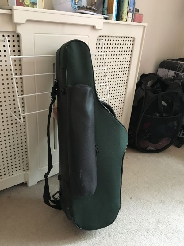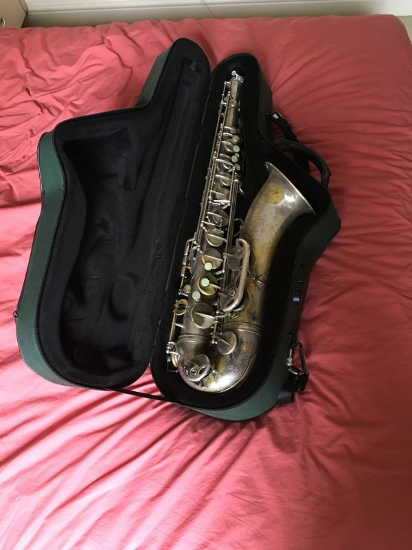 Silver plated Selmer Mark VI Tenor saxophone, with serial number 95102. Was in a dark green BAM classic carrying case.