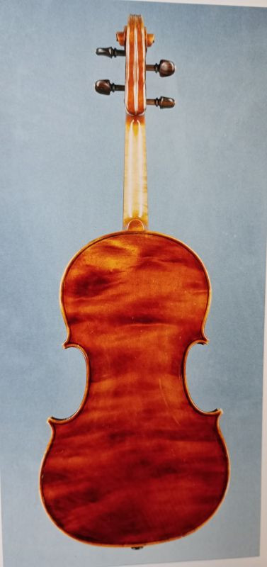 Viola by GA Chanot of Manchester, 16 1/4", dark brown/orange colour, pegs with gold tips, name inscribed under end pin in black ink, beautiful one piece back looks like tigers eye stone.