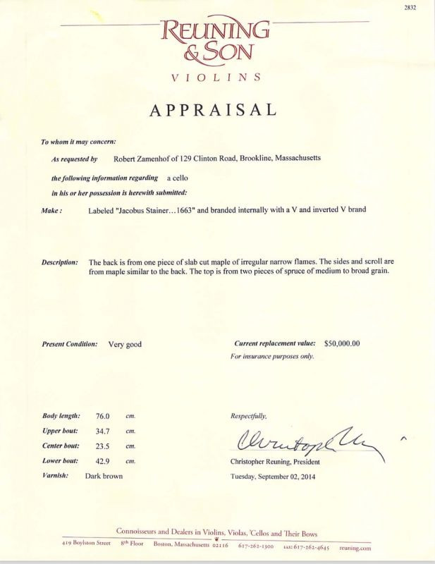 This is a beautiful antique cello with an interior label stating it was made by Jacobus Stainer in 1663. Almost definitely German, probably made by a Stainer assistant in the mid-late 1600's. The cello is in very good condition with a beautiful sound. Below is a recent musical evaluation by Mr. Ronald Lowry, principal cellist of the Boston Pops Orchestra and the Boston Ballet.