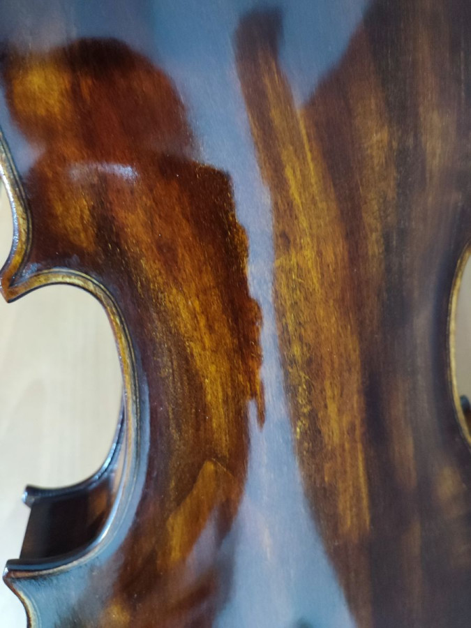 Il colore è marrone color castagno, la vernice è ad alcool.