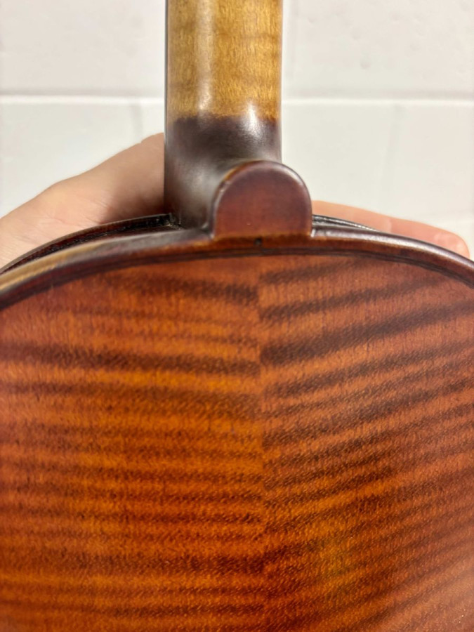 "Backplate: two pieces of narrow, regularly flamed maple with the figure ascending from centre joint; head is of similar wood; the sides of slightly wider flamed maple; the top plate is of two pieces of straight grained spruce of closely spaced reed lines at the centre, growing a little wider towards the flanks; the varnish is of a dark reddish-brown laid over a light straw ground; length of the back 356 mm.