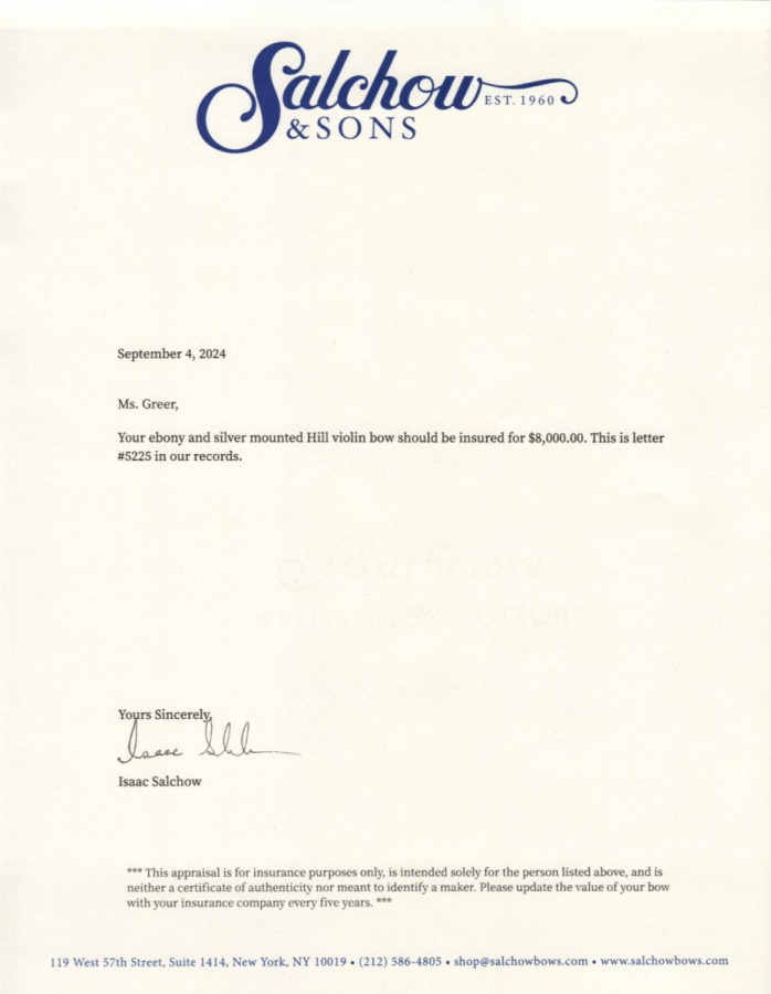 Certification: Appraised in 2024 by Isaac Salchow at Salchow and Sons Violins in New York City.