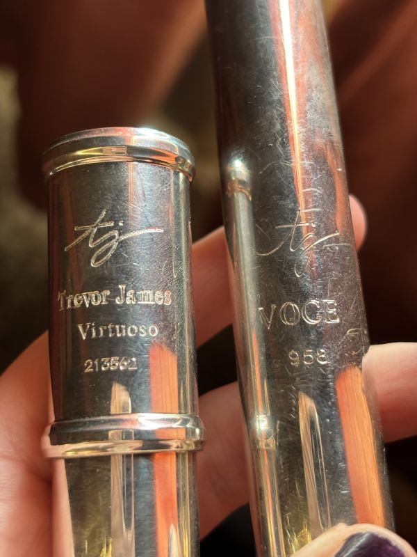 Trevor James Voce head joint (958) with a couple of small dings. TJ virtuoso model, off-set G, open holes, Split e mechanism, C# trill key, B foot joint. Serial Number:213562. I played it with the head joint pulled out about 3/4 of a cm and there would be grime on the body connector after that point. Cherrywood hard case with violet felt on the inside. Exterior TJ soft case, white on inside, black on outside. Originally had a taped label on both exterior and interior case stating “Katheryn and Madeleine Walker”.