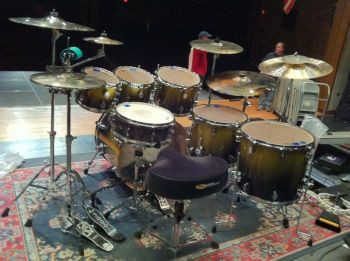 PDP X7 SERIES 5 PC. DRUMSET W/ ZILDJIAN CUSTOM A CYMBALS (HI-HATS, 16" AND 18" CRASHES, 20" RIDE), (1) MEINL 10" DARK CHINA SPLASH, (1) SABIAN 10" HAND-HAMMERED SPLASH, LP TAMBOURINE (WHITE), LP COWBELL (BLACK), LP WOODBLOCK (GREEN), PRECISION CUSTOM SNARE, TAMA KICK/HI-HAT PEDALS, PDP CYMBAL STANDS, (1) STAGG CYMBAL BELL, (1) WUHAN CHINA CYMBAL.