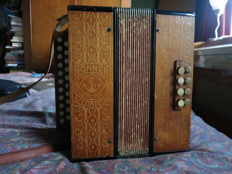 An old (1940s?) Hohner C/F two-row melodeon (diatonic button accordion) in C/F, bellow scuffed but in good condition and airtight. The top outer chord button is cracked at the bottom. No case, thin leather strap.