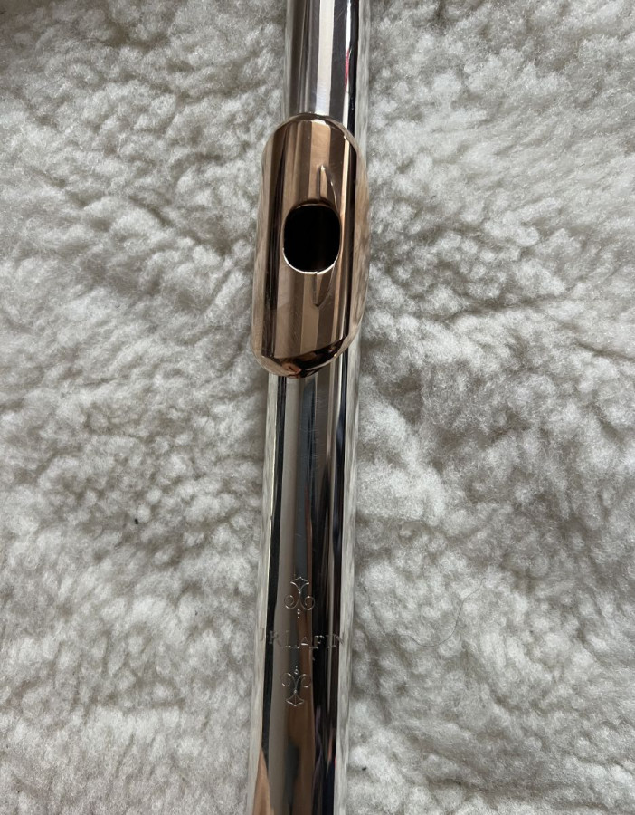 Recently made smaller to fit all standard wall flutes. Lafin headjoint 85% silver / 15% gold with 14k gold lip plate, riser and crown, and Adler wings