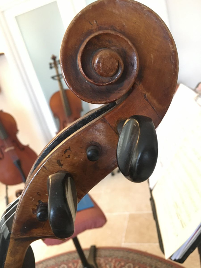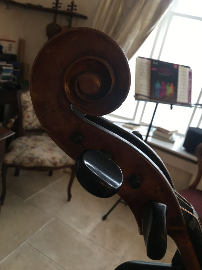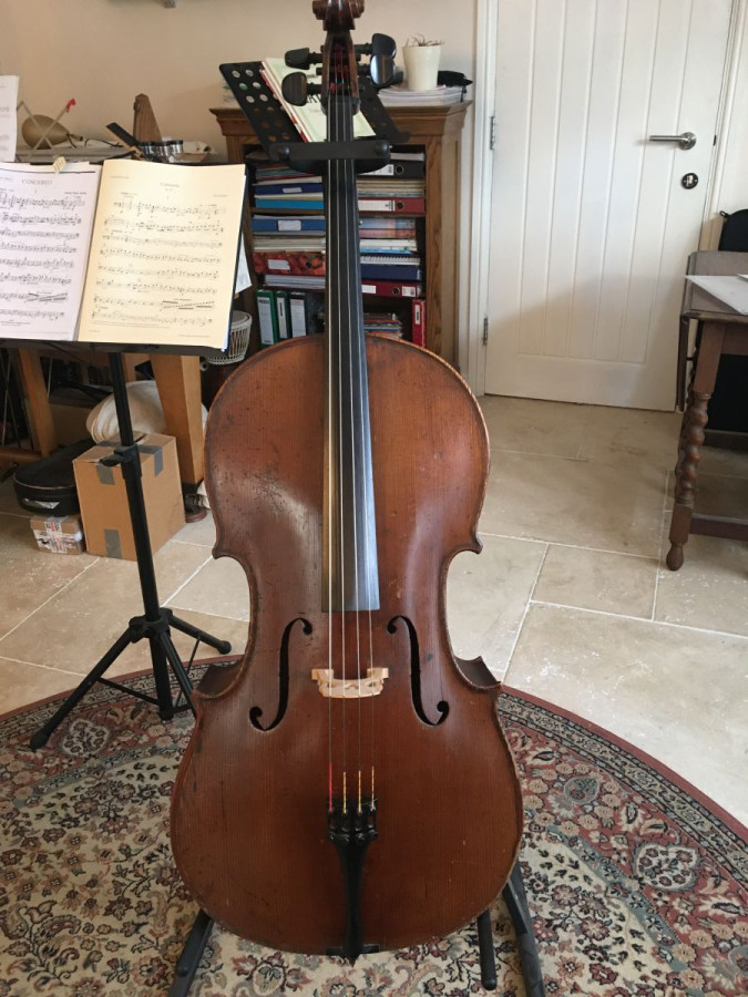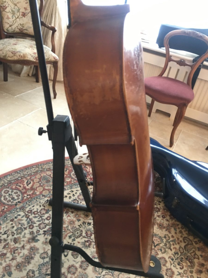 A beautiful cello! Possibly French from around 1890. It has a warm tone and strong, clear projection. Its playability is good and it is set up with Larson Solos and a Spirocore C. It would be a great instrument for an advanced player. Very good condition for its age with no known repairs.