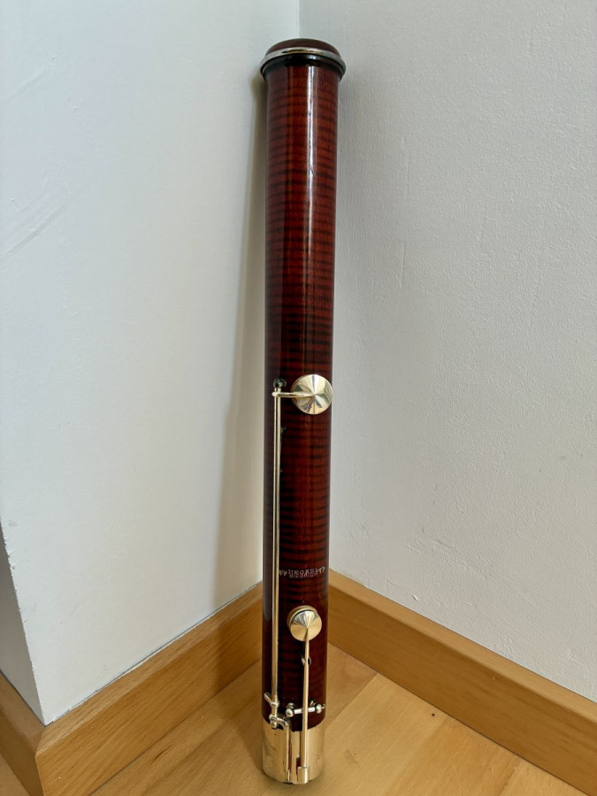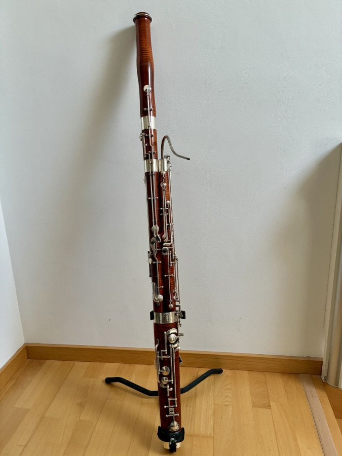 Con el característico sonido Heckel. El instrumento está en muy buenas condiciones y siempre ha sido tocado en orquestas profesionales. Se trata de un modelo compacto y se entrega con dos tudeles Heckel CC1 y C2, campana de La original con su mecanismo, otros extras como la llave para el oído en el meñique izquierdo y el trino de La♭–Si♭, y estuche Marcus Bonna con funda nueva.