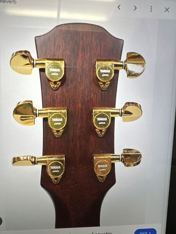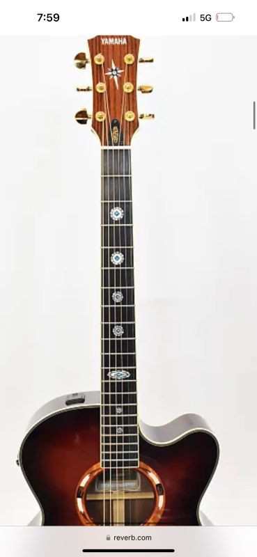 this guitar is a dark wood with silver and turquoise embellishments. Chip on the nut in the corner, making a string slip off. In a brown leather case with red fur interior.