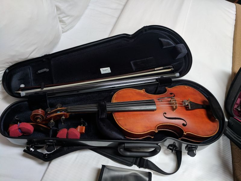 Stolen along with a BAM Hitech carbon fiber case, black. Georgia Bulldogs keyfob. Fine French viola bow with dark pernambuco has been repaired, as well as a Marco Raposo Nickel bow with a fine crack at the tip. Pirastro Korfkerrest shoulder rest gently used. Sanctus Rosin cake- cracked but melted back together.