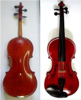 Instrument had deep red glossy varnish, and Evah Pirazzi Gold strings attached, and was encased in a black retangular case.