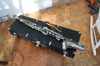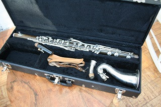 Ebonite single-piece body, with a metal neck and bell and Vandoren mouthpiece. The instrument is in a black case with 3 latches across the top.