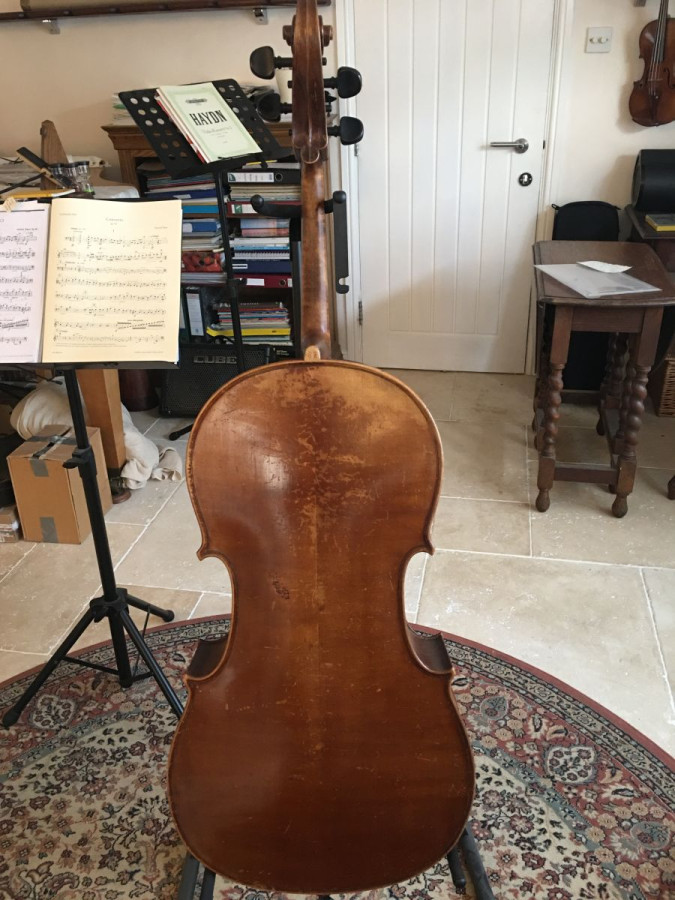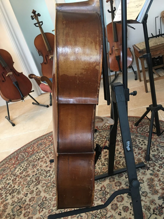 A beautiful cello! Possibly French from around 1890. It has a warm tone and strong, clear projection. Its playability is good and it is set up with Larson Solos and a Spirocore C. It would be a great instrument for an advanced player. Very good condition for its age with no known repairs.