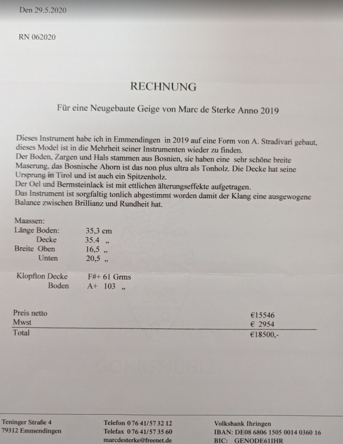 I am selling my beloved violin. The instrument was built for me by the highly regarded violin maker Marc de Sterke in 2019, and has been well looked after since that time with frequent check-ups. I have enjoyed the wonderful characteristics of this instrument, but, since I changed to the viola, I would like this fine violin to find its next home.