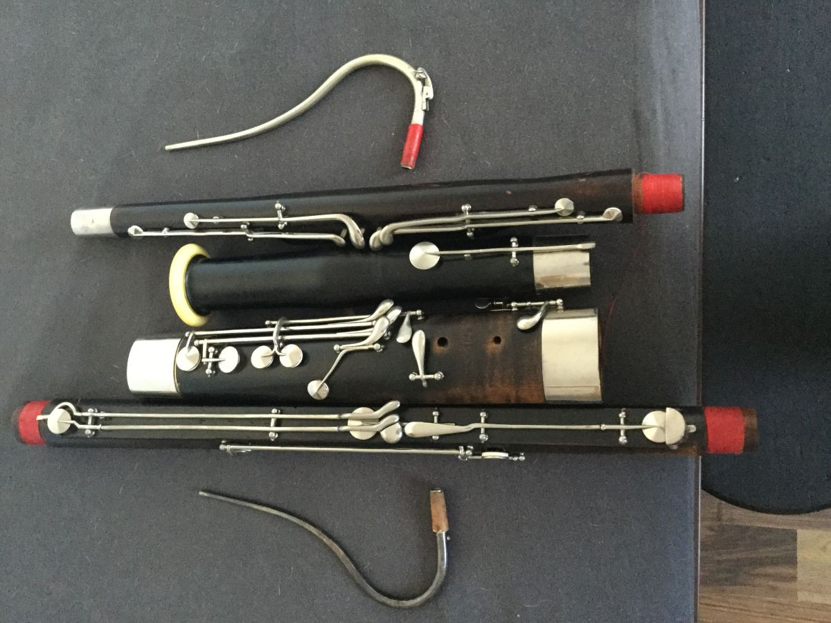 The total . length of the bassoon is approximately 130 cm. The instrument comes with two bassoon bocals, both signed and marked as .