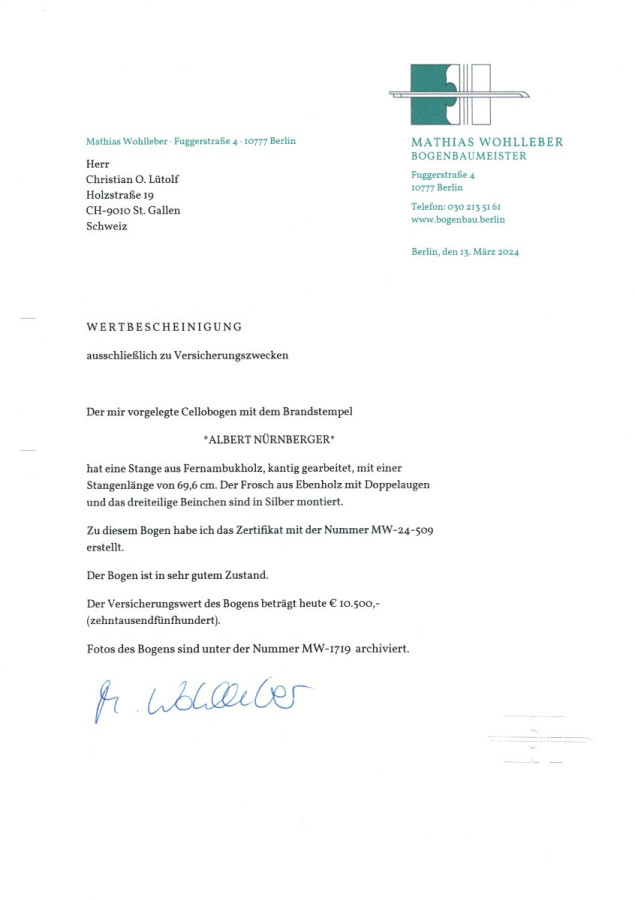 Certification: Authenticity certificate (cf. third-to-last image: word-for-word translation); value certificate (cf. penultimate image); both issued by M. Wohlleber, Berlin-based master bow maker and domain expert