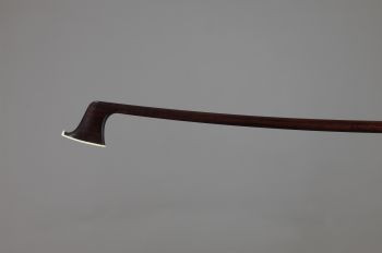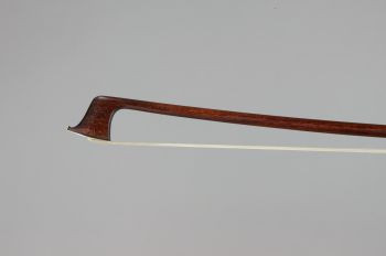 A violin bow made by Pierre Simon in Paris, France ca. 1875. The round stick is made of dark red brown pernambuco and is 72.2 cm long. The original frog (shown in the photo) is tortoise shell with gold mountings with an inlaid gold floral design but has since been replaced by one made of ebony with gold mountings and a Parisian eye. The button is ebony with two gold rings. The original ivory tip has been replaced with gold.
