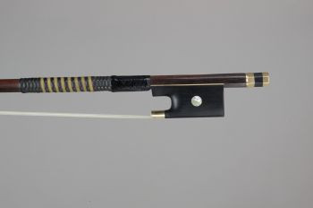 2) A violin bow made by Pierre Simon in Paris, France ca. 1855. The round stick branded GAND FRÈRES is made of medium red brown pernambuco and is 72.5 cm long. The frog is ebony with gold mountings and inlaid pearl eyes. They button is ebony with two gold rings. The original ivory tip has been replaced with gold.