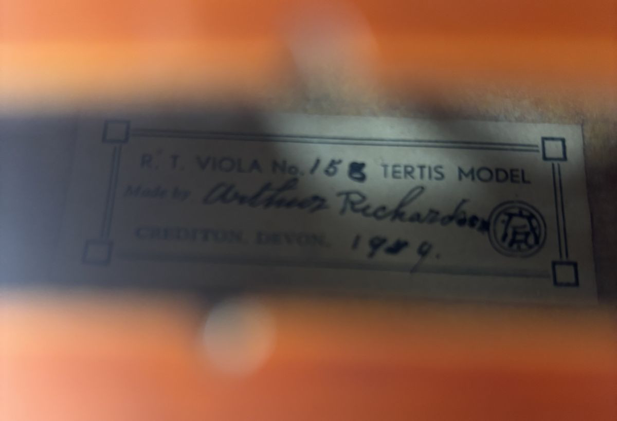 English viola made by Arthur Richardson in 1959, instrument no. 158. A Tertis model, offering a rich, full-bodied sound.