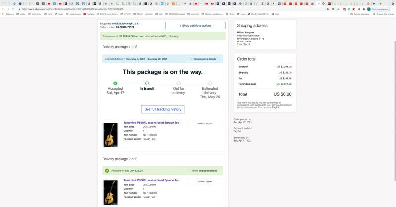Rare Takamine PB-30 bass S/N 28080001 - 1990 august the first order number build of guitar was stolen via ebay refund. the buyer, thanks to the ebay support solution, returned the money for the purchase of the bass, but the guitar was nevertheless delivered by USPS with a delay of 4 months at August 7, 2021 at 2:49 pm RIVERSIDE, CA 92503