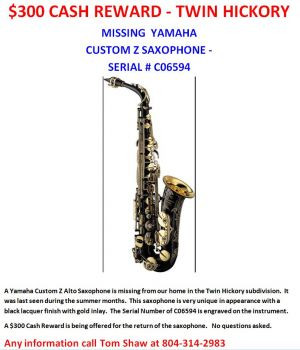 Yamaha Custom Z Saxophone, black lacquer finish with gold inlay. SERIAL NUMBER C06594. $300 Cash Reward - no questions asked. Stolen from our home in Glen Allen, Virginia.