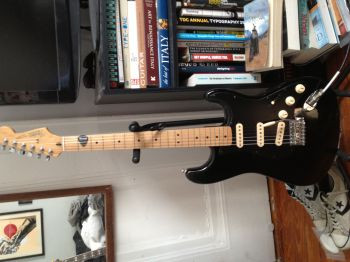 Black Mexican Fender Strat with a maple neck and black pick guard and short whammy bar. The pickups are replaced with a Fat 50, SSL-5, and CS'69. The CS'69 is marked with AY signature. The 5-way toggle is a little wonky due to poor wiring too.