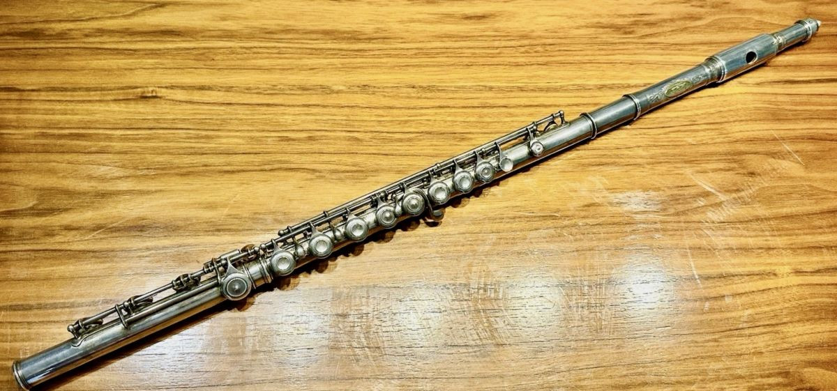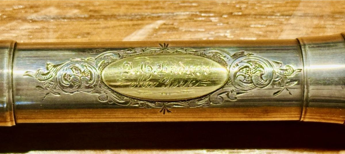 For sale is a Rare Historical Beauty – an Alfred G. Badger’s Improved No. 1 Cylinder Boehm Silver Flute with Gold Plaque, with B Foot, closed G-sharp.