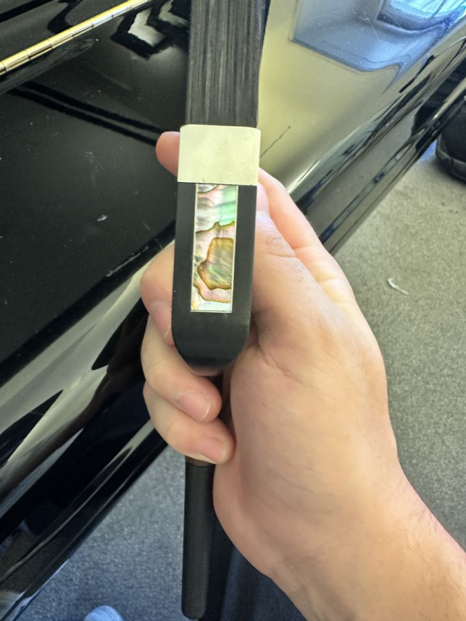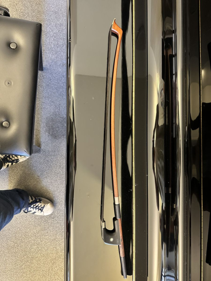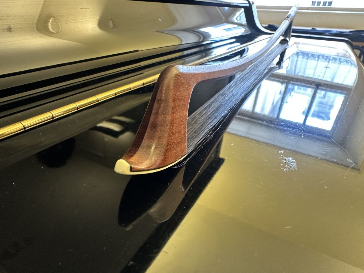 Götz German bow, bought in 2023. Fabulous bow for the price, best value for money on the market. Rehaired by Andrew McGilll in July with black hair.