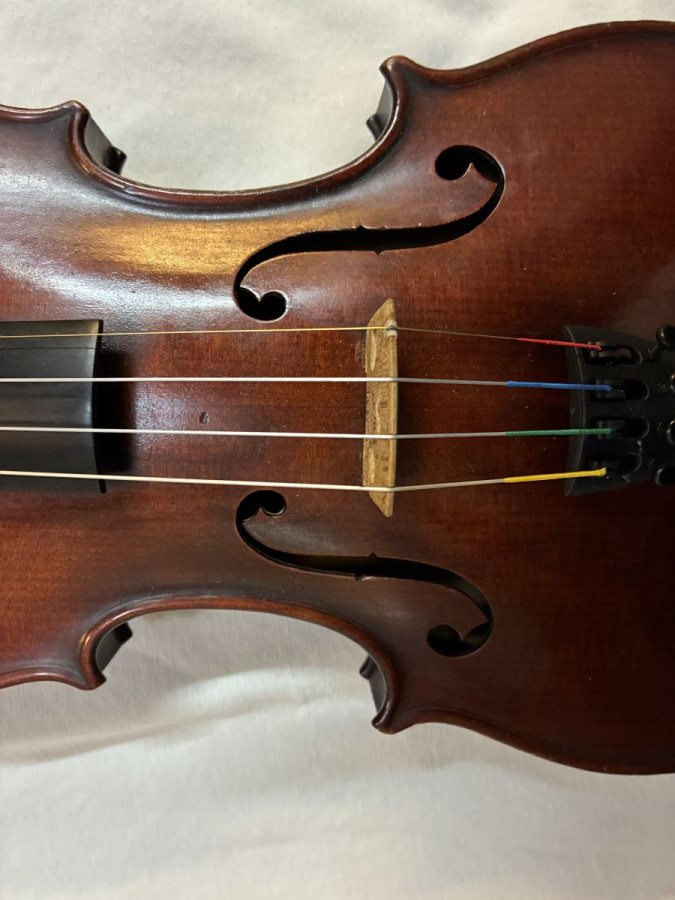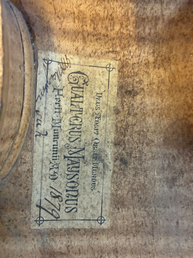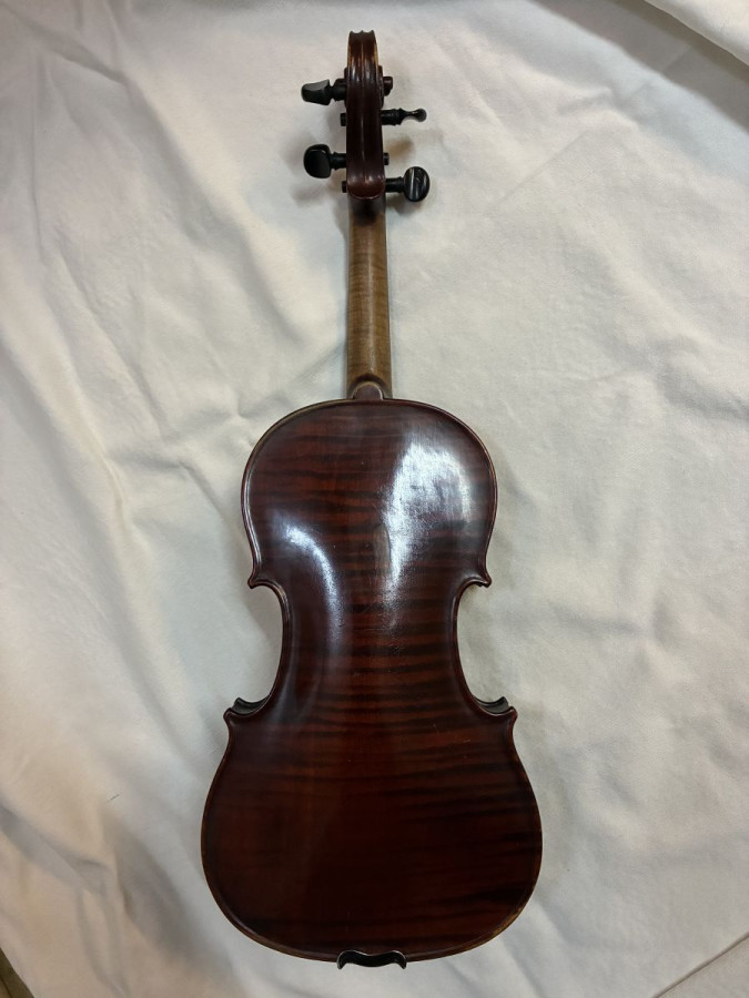 A fine English violin made in Manchester in 1879, bearing its original label, with the original neck and scroll. The oil varnish of a lustrous deep red brown, the back in one piece of richly figured English sycamore with ribs and scroll of similar wood. The f-holes cut in typical Mayson style. The tone is even and carries well.
