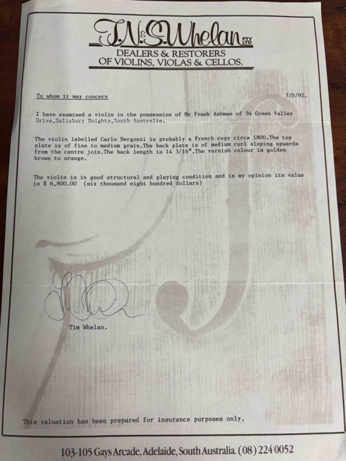 Certification: The latest insurance valuation is available inside the violin. I am located in Adelaide, please come and see and play it.