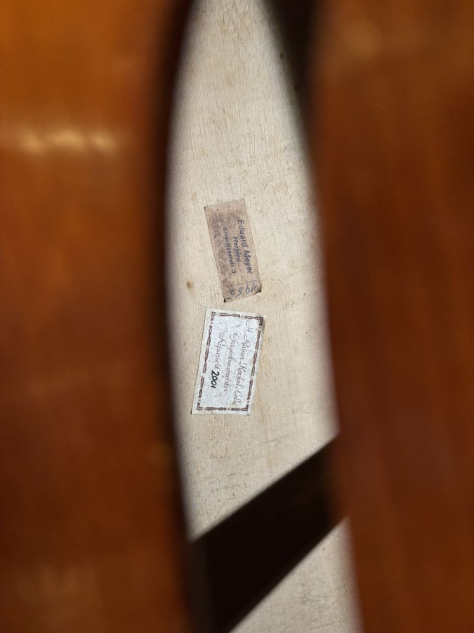German 7/8 size double bass with internal labels from Eduard Meyer, Herford (1955) and a repair label by H. Rainer Knobel, Geigenbaumeister, Erfurt (2001).