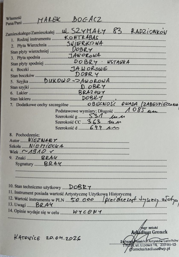 This double bass was building in the first decade of XX century.Is in a very good condition,after the violin maker corection.It’s absolutelly ready to play.Scale lenght 105,5cm.Size 3/4 double bass.