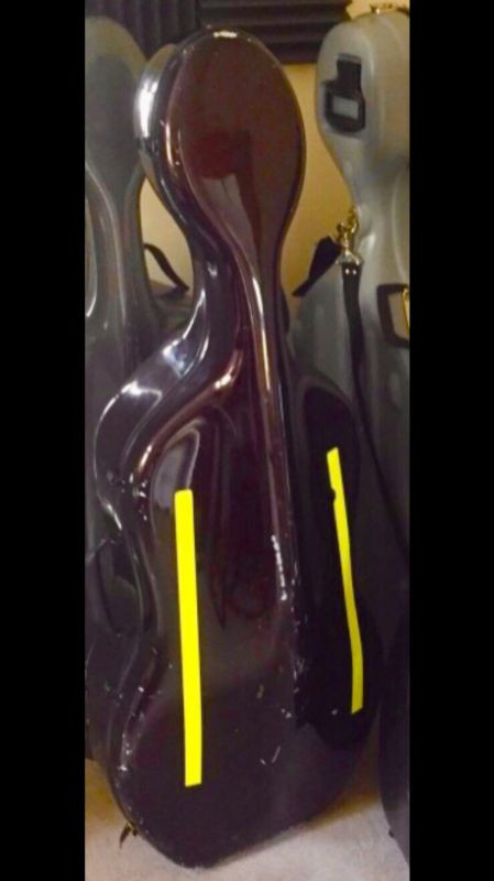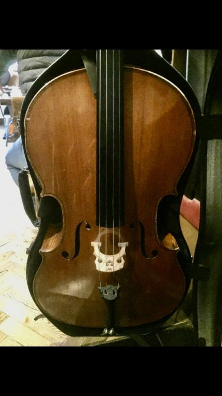 c. 1890s French cello by Jérôme Thibouville Lamy, Mirecourt, with a Neudorfer bow and bridge by J. P. Guivier & Sons, in a maroon carbon fibre Gewa case with two reflective strips on the front and no rucksack straps on the back (pictured).