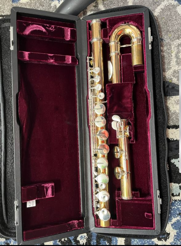 Brass/gold alloy curved head alto flute with silver keys. The case is lined with red. Serial number Y01090.