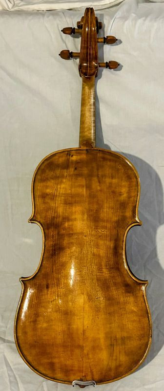 On the back of the instrument you can see two little wooden nail like buttons (pic attached), one above to the brass chin rest support, the other just under the neck. Other distinct features are the rather sharp corners of the instrument, a little bit resembling Venetian school. Orange varnish on amber like background. The instrument had been recently supplied with a carbon fibre sound-post (visible to specialists through the f-holes) which is quite a distinctive feature to look for.