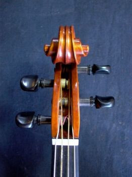 Orange-red baroque violin made in St-James by Charles Riché in 2011; little gold flowers in the center and on the corners.