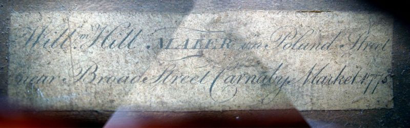 viola labelled Will.m Hill Maker in Poland Street Carnaby Market 1775, in near mint condition with a finely grafted neck and golden-brown varnish, a smaller than average size stop and a relatively wide middle bout
